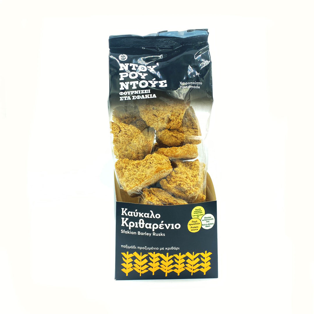 Καύκαλο κριθαρένιο, προζυμένιο, χειροποίητο, χωρίς συντηρητικά, πλούσιο σε πρωτεΐνες, διαιτητικές ίνες, χαμηλά κορεσμένα λιπαρά οξέα, χαμηλή περιεκτικότητα σε σάκχαρα