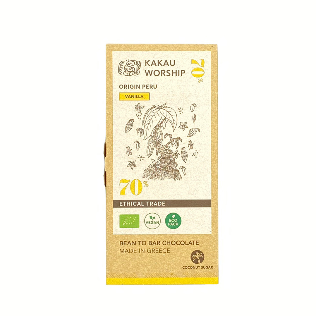 Βιολογική Σοκολάτα Σοκολάτα Vanilla Περού Bio 70% 75gr απο τους Kakau Worship, ελληνική, χωρίς γλουτένη, σόγια και γαλακτοκομικά