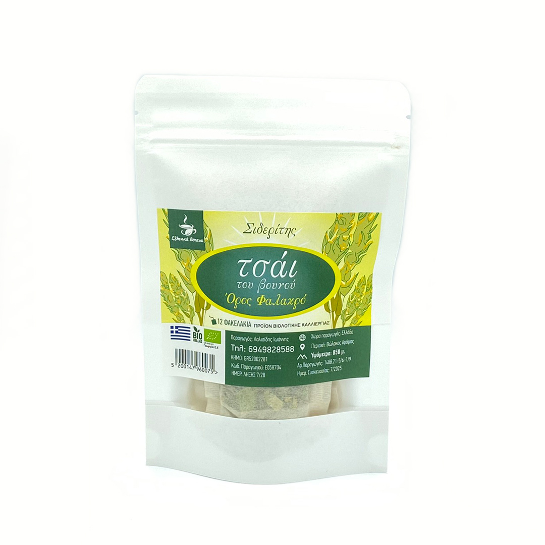 Τσάι του Βουνού Βιολογικό Δράμας. Ποικιλία Ολύμπου (Sideritis scardica) σε συσκευασία 12 ατομικών μερίδων (εμβαπτιζόμενα φακελάκια), απο την οικοτεχνία “Ελληνικά Βότανα” του παραγωγού Ιωάννη Λαλισίδη.