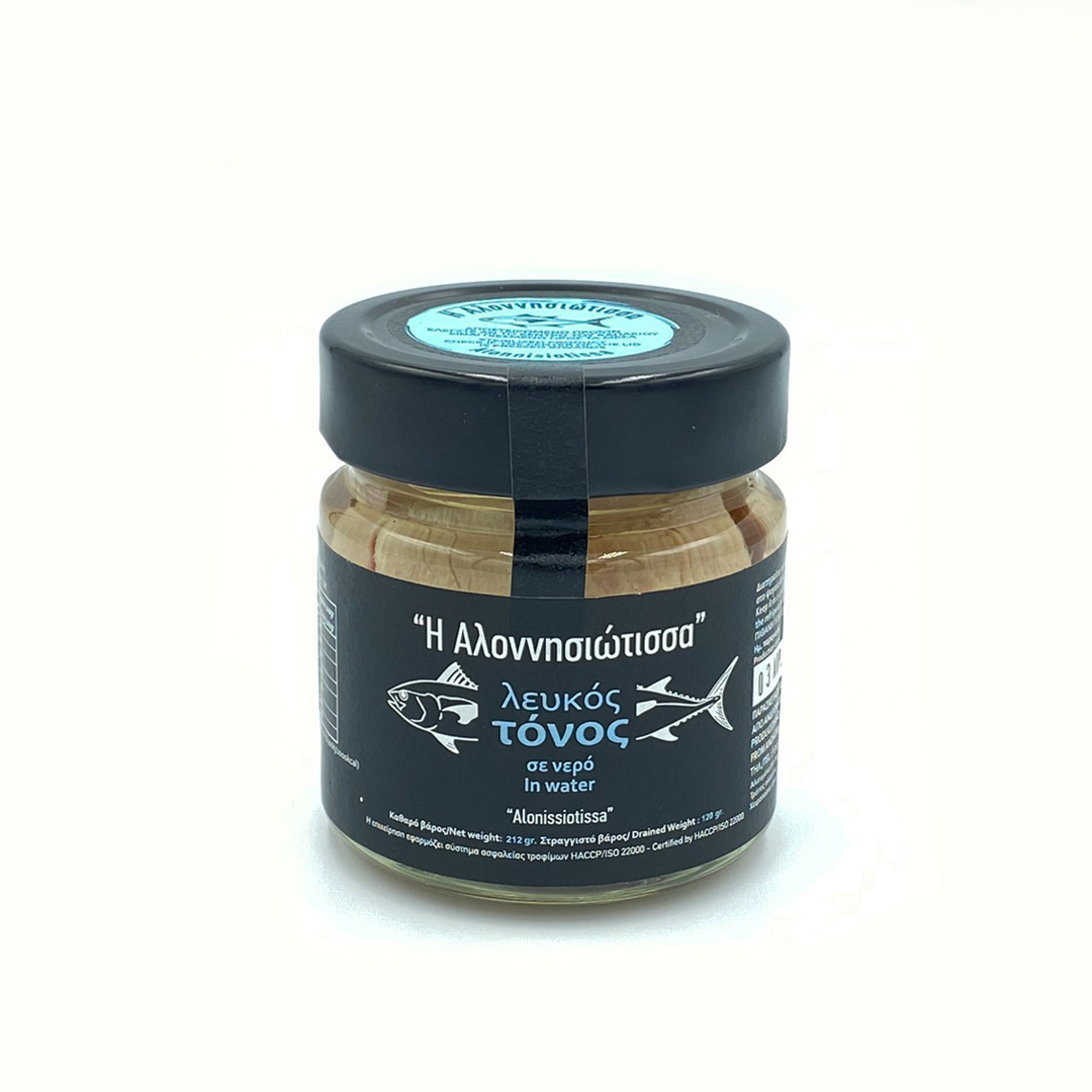 Τόνος λευκός σε νερό Αλονννησιώτισσα. Τρυφερός και γευστικός τόνος απο μια οικογενειακή επιχείρηση με έδρα το Πατητήρι Αλοννήσου, χειροποίητο προϊόν, χωρίς συντηρητικά,